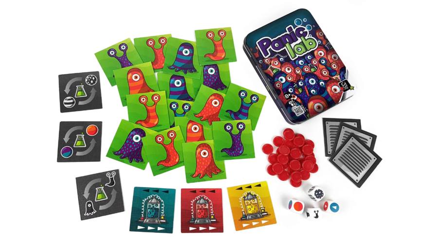 A Panic lab egy pörgős logikai- észlelős játék. A játékosoknak nincs más dolga, mint elsőként csapni le a kis szökevény amőbára, aki megszökött a vizsgálóból, és úgy mászik végig a laboron, hogy használja a teleportot, a szellőzőjáratokat, csíkosról pöttyösre festi magát és így tovább. A játék előkészítése és a szabálymagyarázat egy-két percet vesz mindössze igénybe, egy kör kevesebb mint egy perc és tulajdon képpen addig játszhatjuk, ameddig jól esik. Ez általában még egy és még egy kört jelent. Ráadásul az egész kabátzsebben elfér.
