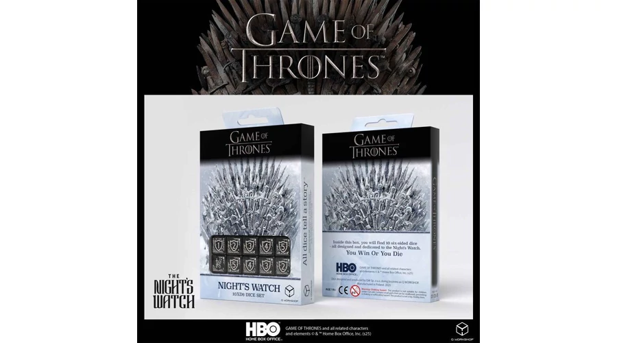 Állj ki a Fal mellett ezzel a Game of Thrones dobókocka Night’s Watch D6 szettel! Tíz csillogó fekete dobókocka sötét dizájnnal – gránitfényű felület, szürke gravírozott jelkép: hollók, falak, fák, az eskü – “Sword in the Darkness”. Tökéletes társasjátékhoz, RPG-hez vagy gyűjteményhez – éjveszély garantálva! 🌙🛡️