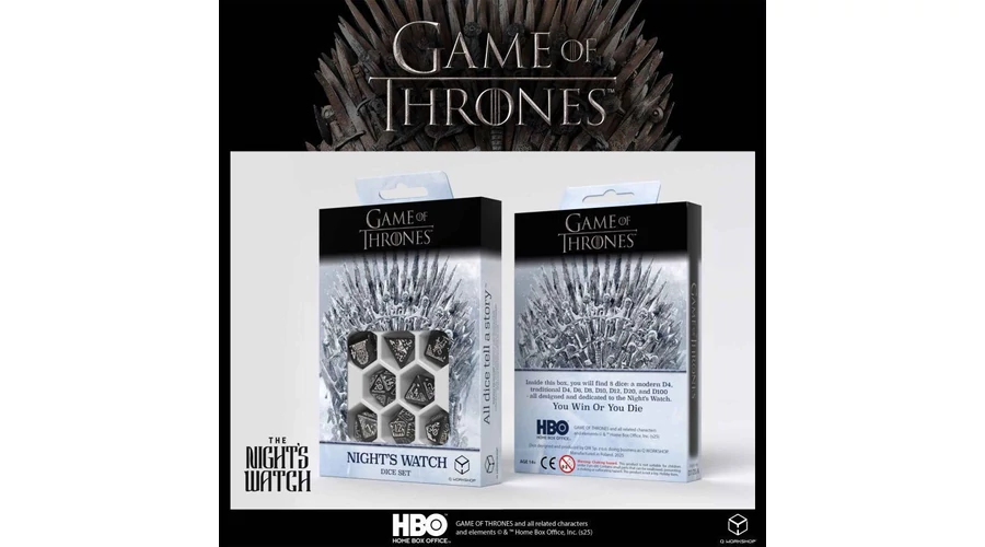 Tedd próbára a sorsodat ezzel a Game of Thrones dobókocka Night’s Watch komplett poliéderes szettel! Nyolc különféle dobókocka (D4, D6, D8, D10, D10%, D12, D20) csillogó fekete és szürke nyomtatással – fal, holló, fák, az Éj esküje, lángok. RPG, társasjáték vagy gyűjtői darabként is ideális – minden dobás a Fal őrzését idézi! 🖤🌒