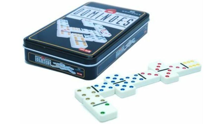 Dominó készlet, dupla 6-os, színes pöttyökkel, fém dobozban -695101