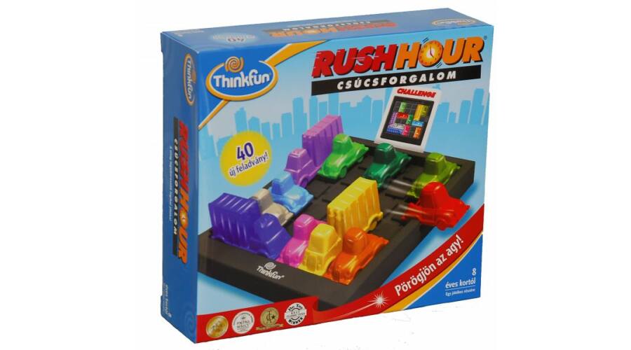 Juss ki a dugóból! A Rush Hour – Csúcsforgalom klasszikus, egyszemélyes feladatmegoldó játék. A játékosnak 40, egyre nehezülő pályán kell a szabályoknak megfelelő módon lépkedni az autókkal, hogy kijuttassák a kis piros kocsit. A logikai képességeket fejlesztő társasjáték.