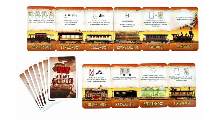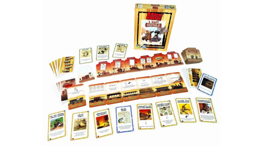 A Bang! A nagy vonatrablás társasjáték kiegészítője új szintre emeli a játékot, és még nagyobb izgalmakat hoz a seriff és a banditák közötti küzdelemben. A játékot 4-8 játékos játszhatják, és ajánlott korosztály 10 éves kortól. A játékidő kb. 60 perc, így garantáltan eltelik egy esti szórakozás a barátokkal vagy a családdal.