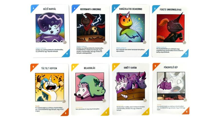 A Unikornisok: A rémes ménes (Unstable Unicorns) egy könnyen tanulható, de taktikus dedikált kártyajáték 2–8 játékos számára, ahol célod: először összegyűjteni 7 unikornist a saját stabilodon. Eközben pakolj upgrade és downgrade (fejlesztő/rontó) kártyákat, hogy segítőket hívj be, vagy akadályozd az ellenfeleidet.