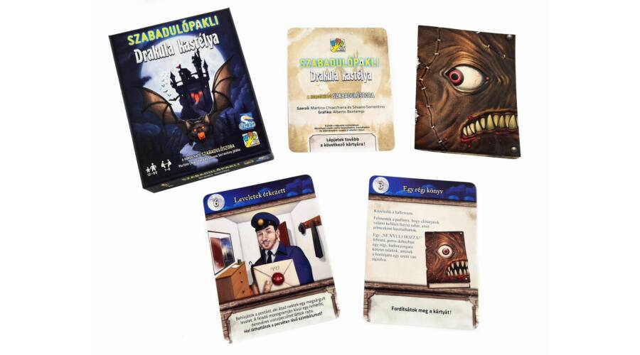 Szabadulópakli – Drakula kastélya társasjáték doboz és kártyák